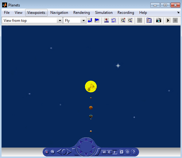 Пример Planets загружается, и виртуальный мир отображается в средстве просмотра Simulink 3D Animation Viewer.