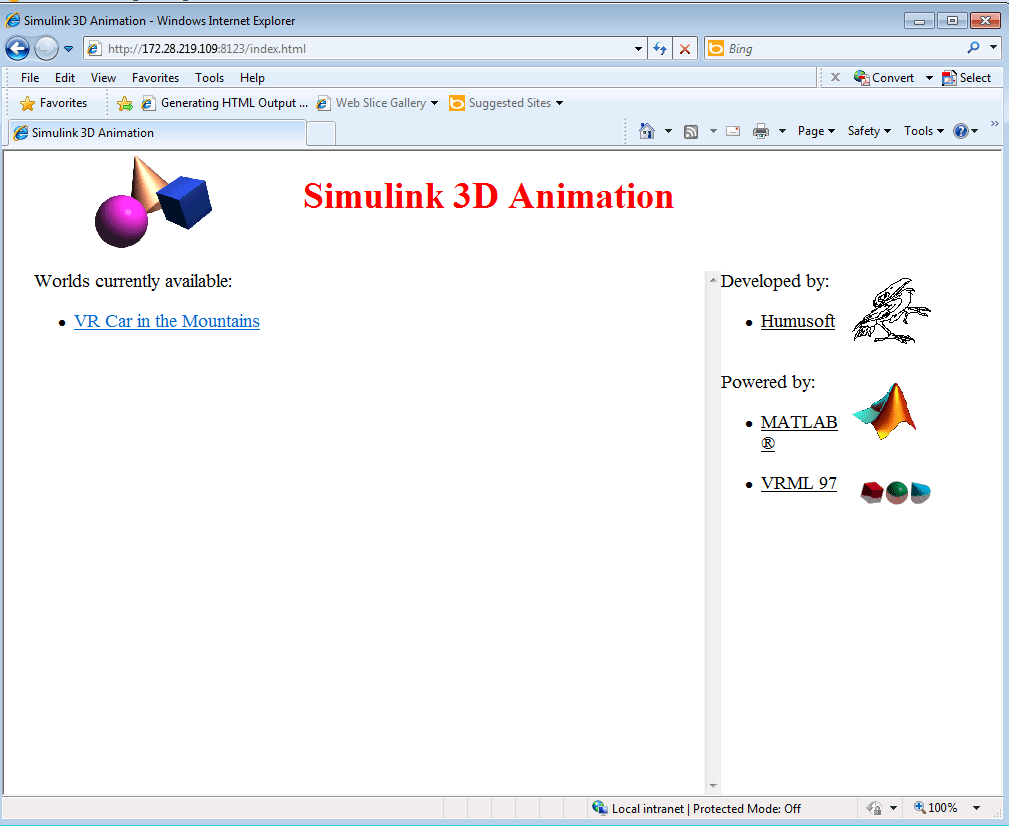 В веб-браузере отображается главная HTML-страница Simulink 3D Animation. В списке только один виртуальный мир, так как открыта только одна модель Simulink.