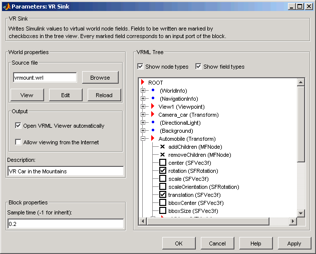 Откроется диалоговое окно Параметры блока приемника VR (VR Sink block parameters).