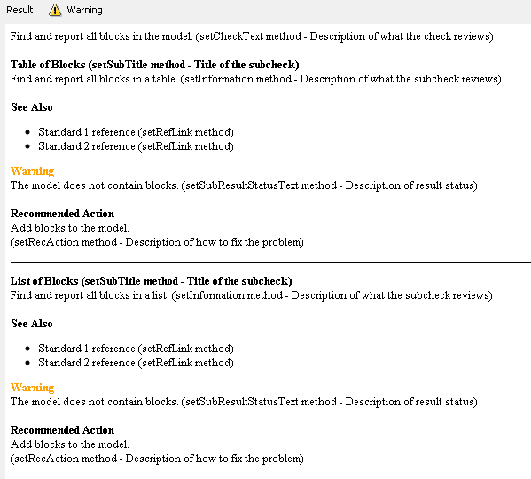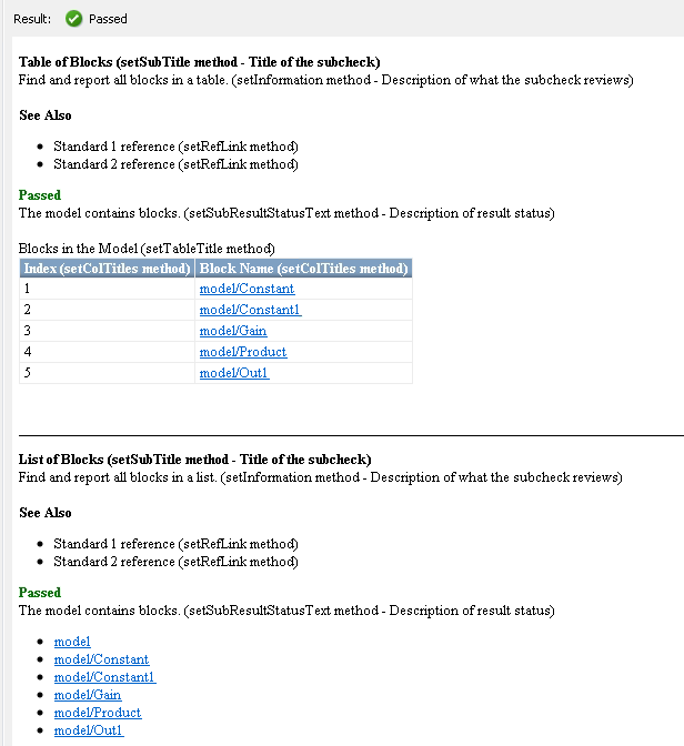 Следующий код создает два объекта шаблона: ft1 и ft2и использует их для форматирования результата выполнения проверки в таблице и списке. Результат определяет блоки в модели. Графика, следующая за кодом, отображает выходные данные в том виде, в каком они отображаются в Model Advisor, когда проверка проходит и завершается неуспешно.