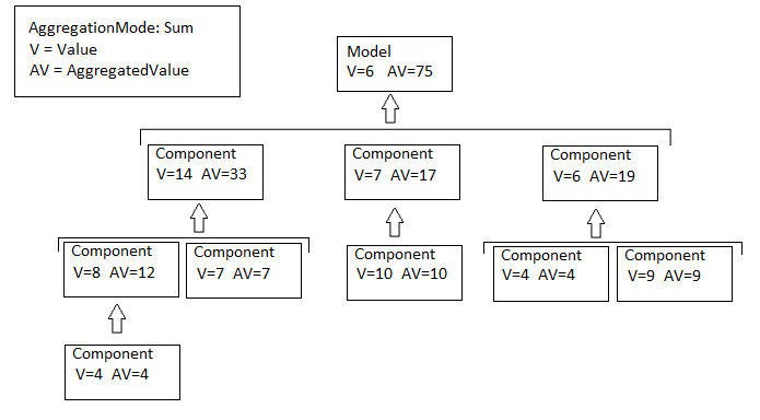 На этой диаграмме показано, как программное обеспечение агрегирует метрические данные по компонентам иерархии модели. Родительская модель находится в верхней части иерархии. Компоненты могут быть следующими: