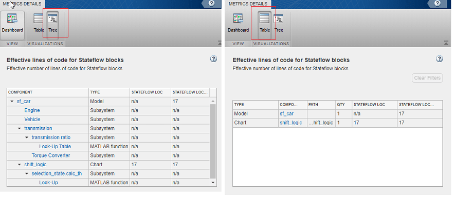 В представлении Таблица (Table) и Дерево (Tree) значение или агрегированное значение n/a указывает, что результаты недоступны для этого компонента. Если значение и агрегированное значение равны n/a, в табличном представлении компонент не отображается. Древовидное представление перечисляет такой компонент. Для виджета Stateflow LOC на изображении показано сравнение.