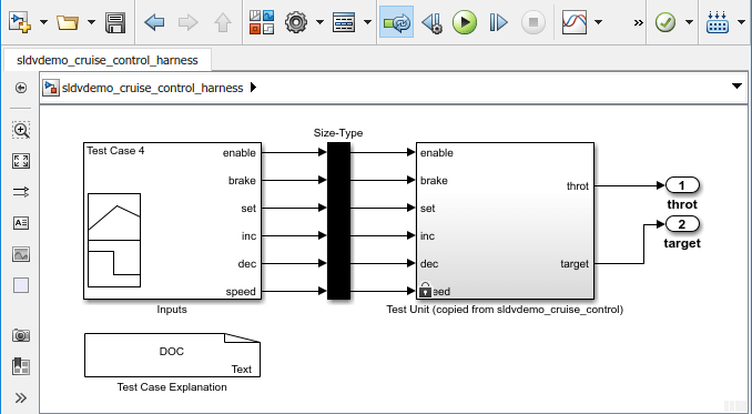 После анализа программа открывает модель электрического жгута. sldvdemo_cruise_control_harness и сохраняет его в расположении по умолчанию <current_folder>\sldv_output\sldvdemo_cruise_control\sldvdemo_cruise_control_harness.slx. Дополнительные сведения см. в разделе Simulink Design Verifier Модели кабелей (Simulink Design Verifier).
