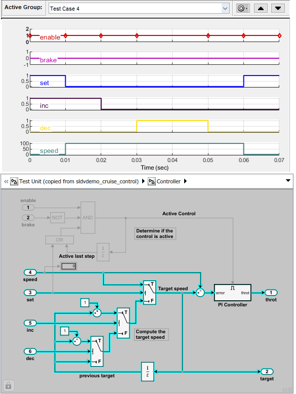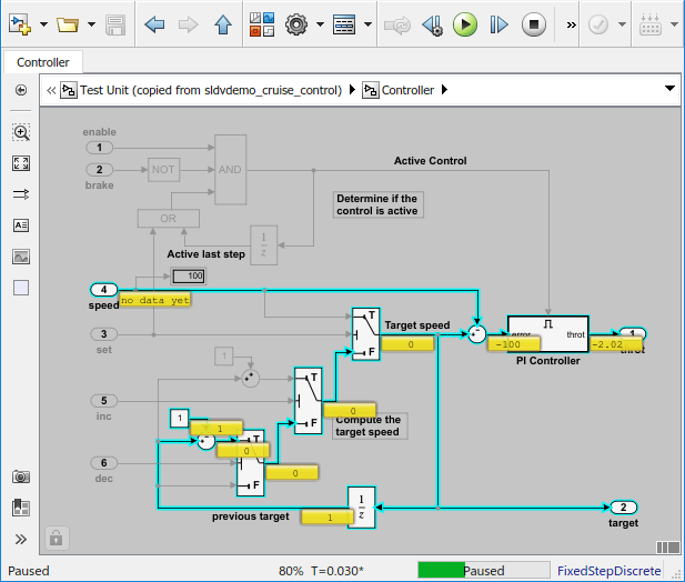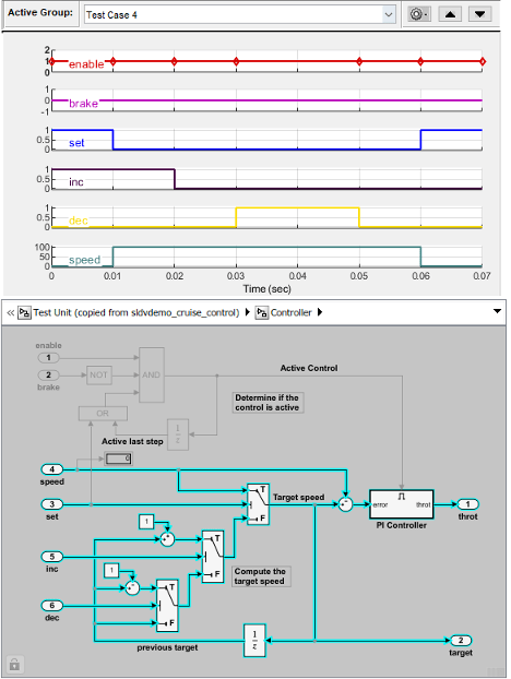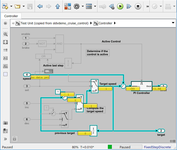 Чтобы отладить моделирование для тестового случая, в редакторе Simulink для sldvdemo_cruise_control_harness нажмите кнопку Шаг вперед (Step Forward). На каждом шаге времени можно просмотреть значения сигнала и выделенный фрагмент. Дополнительные сведения см. в разделе Параметры степпинга моделирования. Значения сигнала и зависимости при T=0.010 появляется.