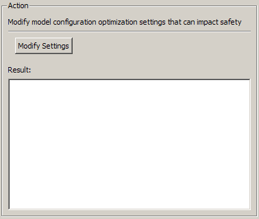 При указании пользовательского исправления проверки функция определения проверки должна также содержать функцию обратного вызова действия. В функции определения проверки создайте экземпляр ModelAdvisor.Action класс. Определите функцию обратного вызова действия и передайте ему дескриптор setCallbackFcn способ. При определении действия Помощник по модели (Model Advisor) включает поле Действие (Action) под полем Анализ (Analysis). Поле Действие (Action) содержит кнопку для фиксации модели или подсистемы. В приведенном ниже примере кнопка имеет имя Modify Settings.