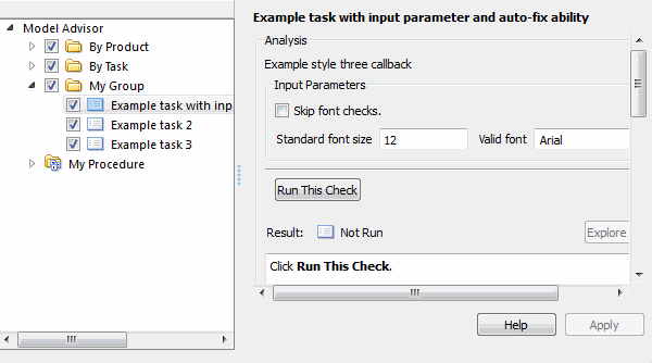 Можно настроить Model Advisor с помощью ModelAdvisor.Group и ModelAdvisor.FactoryGroup вместо редактора конфигурации Model Advisor. Однако эти API являются менее гибким и более трудоемким способом настройки Model Advisor. Чтобы разместить настраиваемые проверки в настраиваемых папках на верхнем уровне дерева Model Advisor (корневой каталог Model Advisor), используйте команду ModelAdvisor.Group класс. Чтобы разместить настроенные проверки в новых папках в папке «По заданию», используйте ModelAdvisor.FactoryGroup класс. Необходимо включить методы, которые регистрируют эти задачи и папки в sl_customization функция.