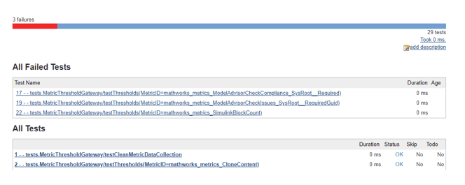 Для этого примера: MetricThresholdGateway.m единичный тест не прошел для трех метрик, поскольку эти метрики не соответствовали пороговым значениям. Чтобы исследовать эти данные, необходимо загрузить их локально.