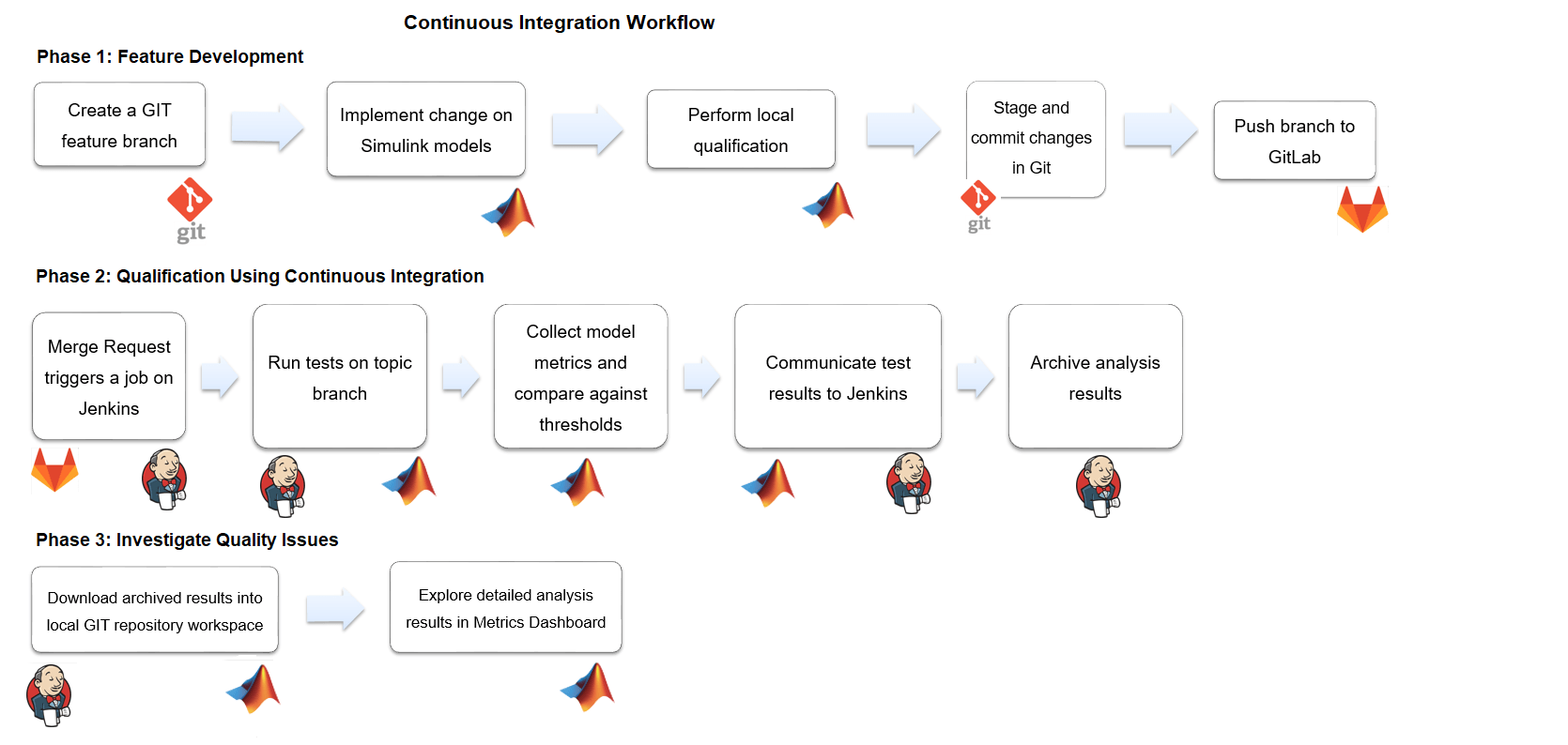 В этом примере показано, как использовать панель мониторинга Metrics с инструментами с открытым исходным кодом GitLab™ а также Jenkins™ для тестирования и уточнения модели в непрерывном рабочем процессе интеграционных систем. Непрерывная интеграция - это практика объединения всех рабочих копий файлов проекта разработчика на общую магистраль. Этот рабочий процесс экономит время и повышает качество, поддерживая контроль версий, автоматизируя и стандартизируя тестирование.
