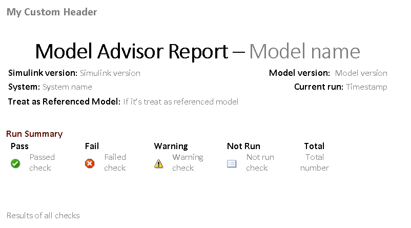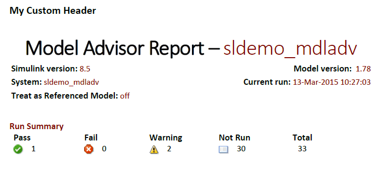 В этом примере показано, как добавить заголовок в PDF-версию отчета Model Advisor.