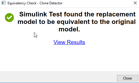 При наличии лицензии Simulink Test™ можно нажать кнопку Проверить эквивалентность. Откроется окно, в котором будет показано, что текущая модель успешно преобразована в эквивалентную модель.