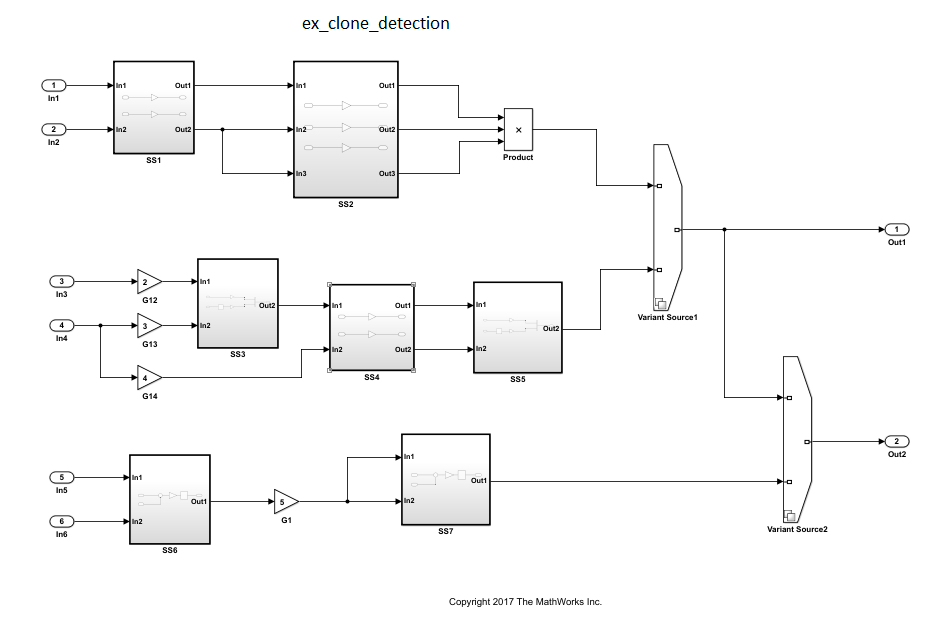 Существует два типа клонов: точные клоны и подобные клоны. Точные клоны имеют одинаковые типы блоков, соединения и значения параметров. Подобные клоны имеют одинаковые типы блоков и соединения, но могут иметь различные значения параметров блоков. Например, значение блока усиления может отличаться в аналогичных клонах, но должно быть одинаковым в точных клонах.