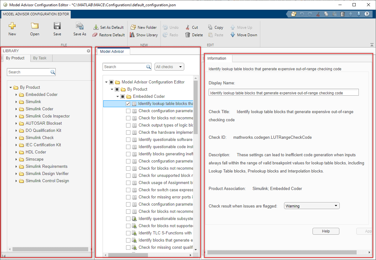 Чтобы создать новую конфигурацию, нажмите кнопку «Создать» на панели инструментов. Используйте команду Сохранить как (Save As), чтобы переименовать файл конфигурации. Файлы конфигурации Model Advisor сохраняются в.json формат.