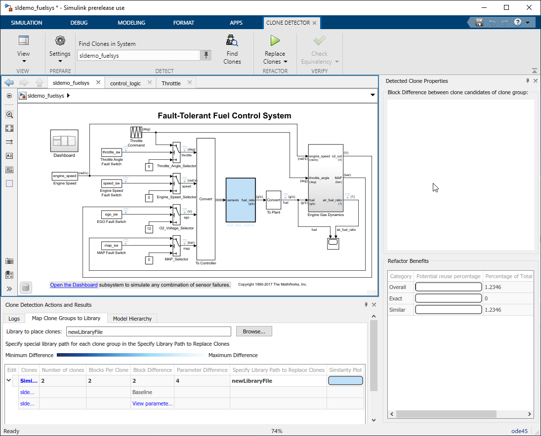 Сохраните модель в рабочей папке и на вкладке Детектор клонов (Clone Detector) щелкните Заменить клоны (Replace Clones). Приложение по возможности заменяет аналогичные клоны ссылками на маскированные библиотечные подсистемы.