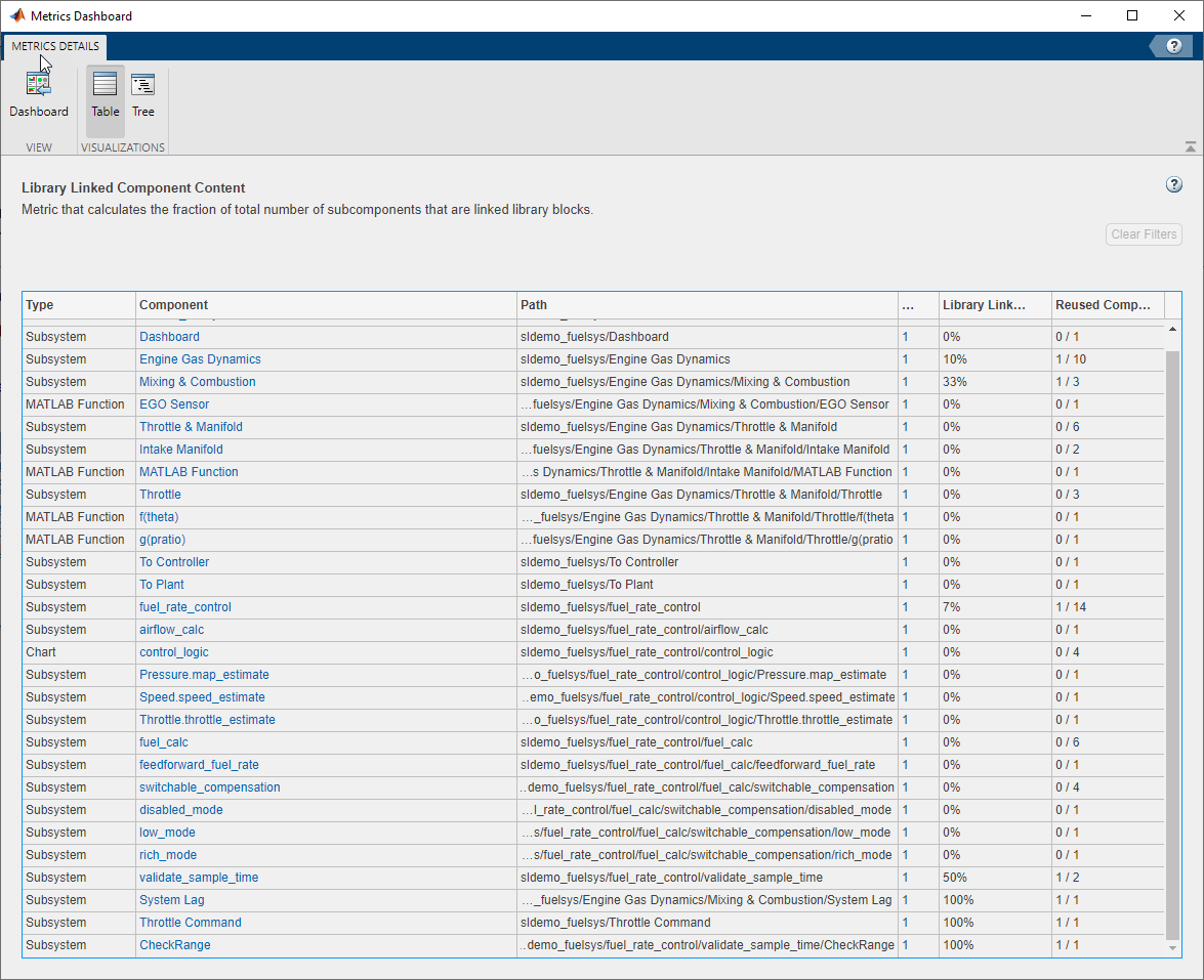 Используйте приложение Clone Detector, чтобы выполнить рефакторинг модели, улучшить компонентность и удобочитаемость модели, а также повторно использовать компоненты в модели. В этом примере детектор клонов запускается с панели управления метриками. Однако его также можно открыть, открыв вкладку Приложения и щелкнув Детектор клонов.