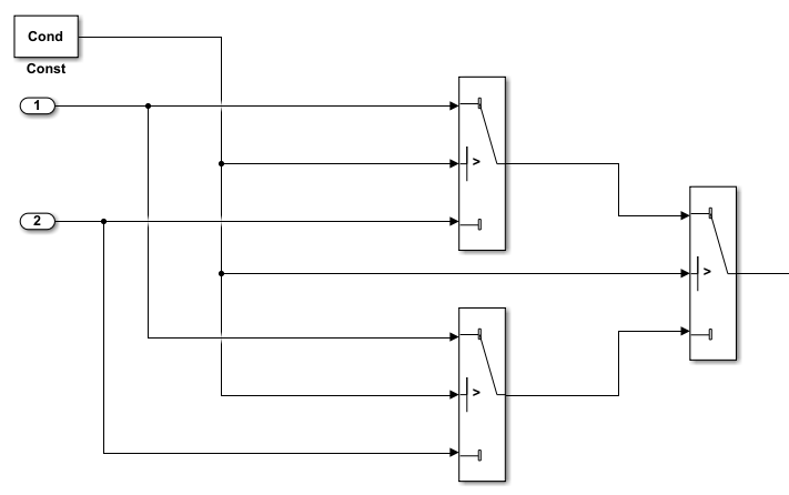 Если блок If соединяется с одной или несколькими подсистемами If Action и каждая из них имеет один выходной порт, замените этот шаблон моделирования подсистемой и блоком Variant Source.
