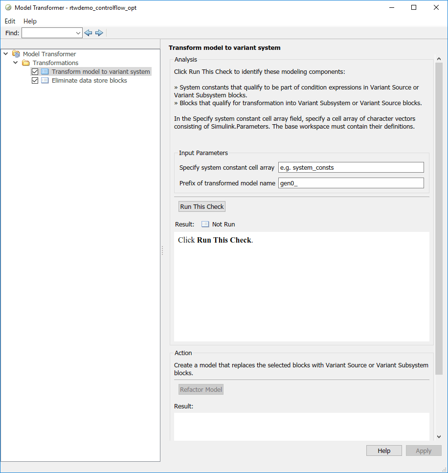 Выберите Выполнить эту проверку. Модельный трансформатор (Model Transformer) перечисляет системные константы и блоки, которые могут быть частью выражений условий в блоках Источник исполнения (Variant Source) или Подсистема исполнения (Variant Subsystem). Чтобы модель трансформатора могла перечислить системную константу, она должна быть Simulink.Parameter объект скалярного типа. Для этого примера: Cond соответствует части выражения условия.