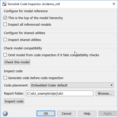 Диалоговое окно Simulink ® Code Inspector™ с параметрами по умолчанию отображается следующим образом.