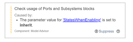 Чтобы просмотреть нарушение проверки, щелкните значок ошибки или предупреждения над выделенным блоком. Откроется окно диагностики, содержащее информацию о проблеме моделирования, которая нарушает проверку Model Advisor. Если блок нарушает проверки, используйте окно диагностики для просмотра проблем. Для каждой проблемы можно использовать диагностическое окно, чтобы: