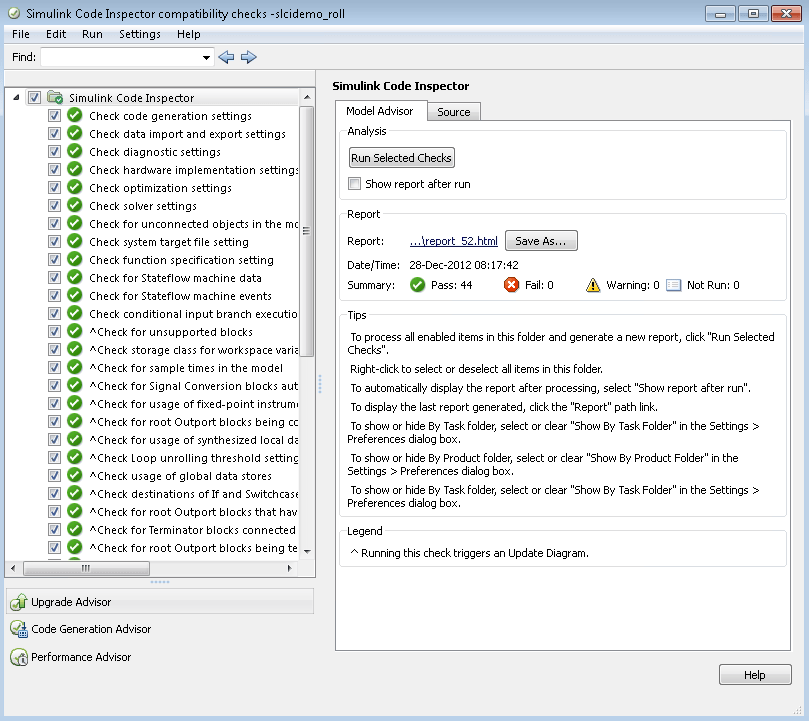 Окно Model Advisor можно использовать для выбора и выполнения проверок совместимости Simulink Code Inspector в подсистеме. См. раздел Выполнение проверок помощника по модели.