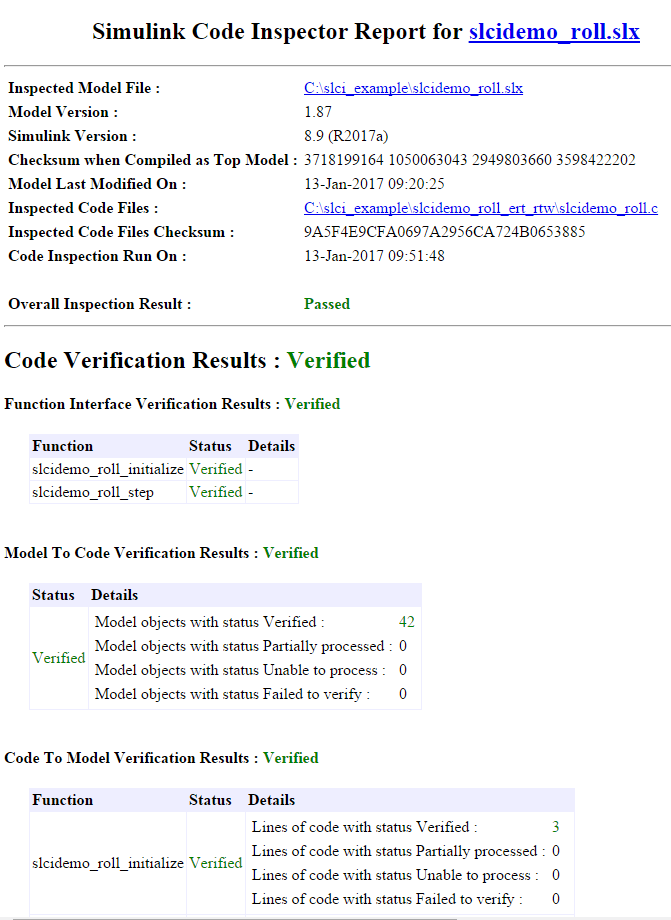 Сводный отчет содержит ссылки на подробные отчеты по проверке кода для модели верхнего уровня и каждой ссылочной модели. Например, вот самая верхняя часть отчета по проверке кода для верхней модели, slcidemo_roll: