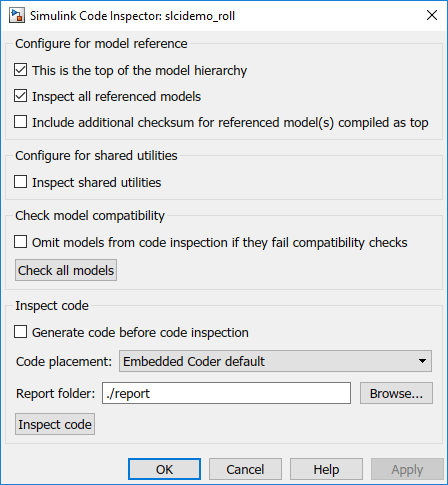 Откройте диалоговое окно Simulink Code Inspector, если оно еще не открыто, и проверьте настройки параметров проверки кода. Параметр Code placement имеет значение Embedded Coder default, которая настраивает проверку кода для использования структуры папок Embedded Coder по умолчанию, созданной при создании кода.