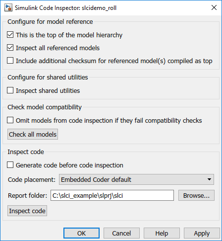 Откройте диалоговое окно Simulink Code Inspector, если оно еще не открыто, и проверьте настройки параметров проверки кода. Параметр Code placement имеет значение Embedded Coder default, которая настраивает проверку кода для использования структуры папок Embedded Coder по умолчанию, созданной при создании кода.