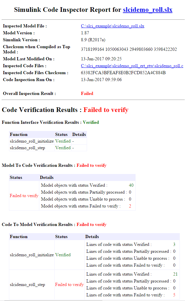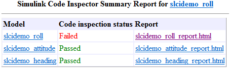 Сводный отчет содержит ссылки на подробные отчеты по проверке кода для модели верхнего уровня и каждой ссылочной модели. Например, вот самая верхняя часть отчета по проверке кода для верхней модели, slcidemo_roll.