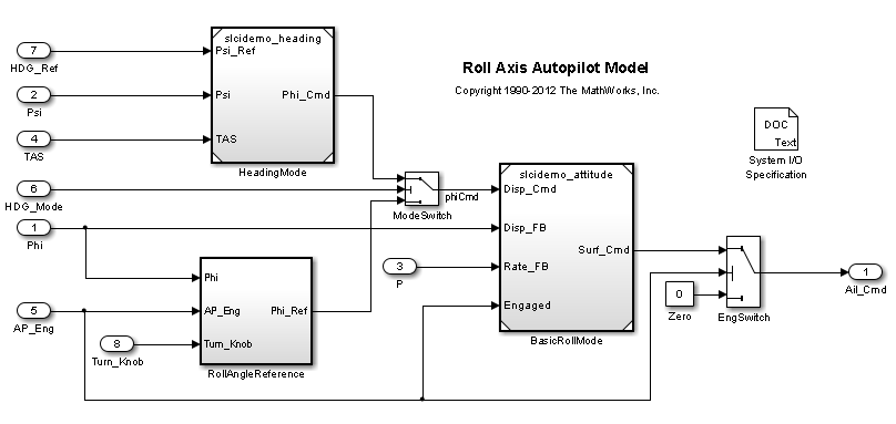 Данная модель представляет собой основной автопилот оси крена с двумя режимами работы: удержание положения крена и удержание курса. Логика режимов для этих режимов является внешней для этой модели. Архитектура модели представляет режим удержания заголовка и базовую функцию ориентации крена в качестве ссылочных моделей. Модель включает в себя: