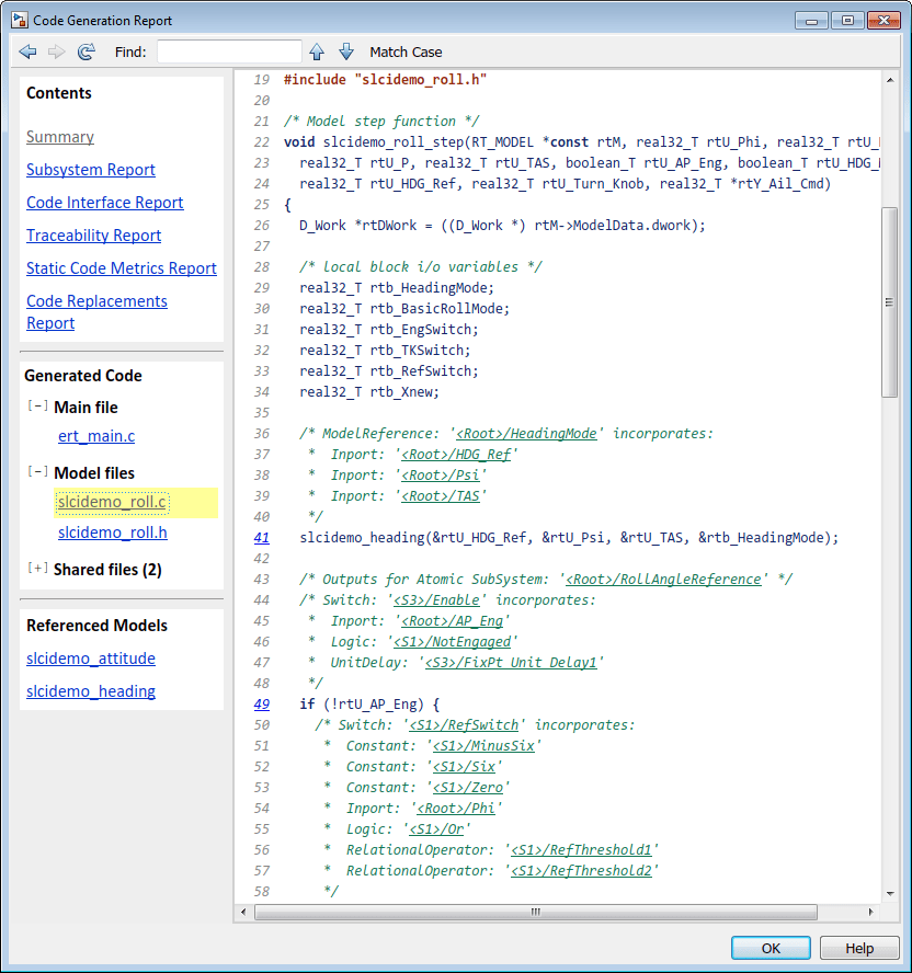 >> cfile = fullfile('.','slcidemo_roll_ert_rtw','slcidemo_roll.c');