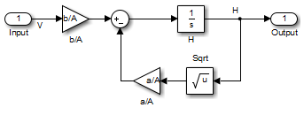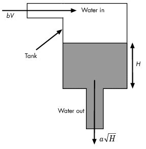 Вода поступает в бак сверху со скоростью, пропорциональной напряжению В, приложенному к насосу. Вода выходит через отверстие в основании резервуара со скоростью, пропорциональной квадратному корню высоты воды H в резервуаре. Наличие квадратного корня в расходе воды приводит к нелинейной установке.