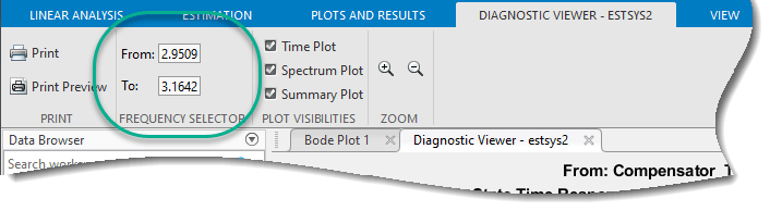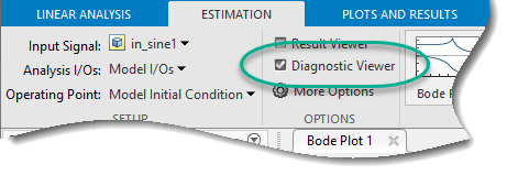 Используйте средство просмотра диагностики для анализа результатов оценки частотной характеристики, полученных путем выполнения шагов в окне Оценка частотной характеристики с помощью линеаризатора модели, с дополнительным шагом активации средства просмотра диагностики перед выполнением оценки. Для этого на вкладке Оценка (Estimation) выберите Средство просмотра диагностики (Diagnostic Viewer).