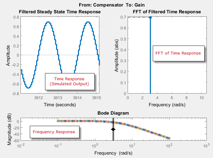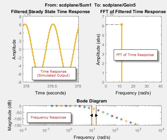 При выполнении оценки частотного отклика можно проанализировать результат, изучив необработанный смоделированный отклик и БПФ, используемый для преобразования его в расчетный частотный отклик. Для этого используйте средство просмотра диагностики (в линейизаторе модели) или средство просмотра результатов моделирования (в командной строке MATLAB ®).