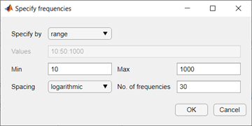 В диалоговом окне «Задать частоты» задайте частоты одним из следующих параметров: range или values. По умолчанию в диалоговом окне можно задать логарифмически разнесенные или линейно разнесенные частоты по диапазону. Чтобы задать частоты по значениям, в списке Указать по (Specify by) выберите values, а затем укажите вектор частотных значений с помощью параметра Values. Значения частоты должны лежать между наименьшей и наибольшей частотными точками в модели, которую требуется уменьшить.