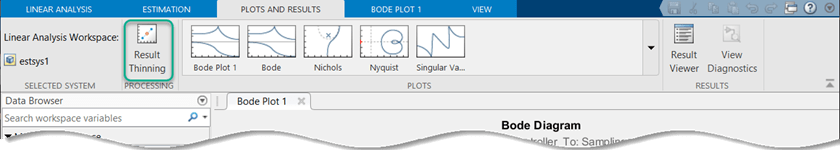 Чтобы применить утончение к результату расчетной частотной характеристики, выберите расчетную модель на панели Рабочее пространство линейного анализа (Linear Analysis Workspace) или Рабочее пространство MATLAB (MATLAB Workspace). Затем на вкладке Графики и результаты (Plots and Results) щелкните Прореживание результата (Result Thinning).