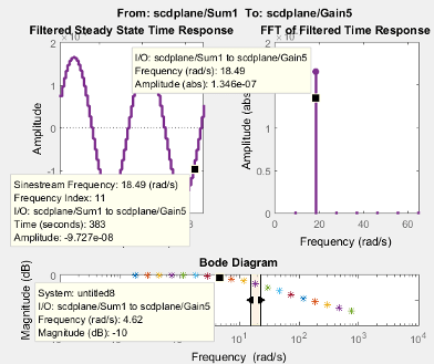 На предыдущем рисунке всплывающая подсказка данных временного отклика показывает, что индекс частоты равен 11. Этот частотный индекс можно использовать для изменения соответствующей части входного сигнала. Например, для изменения NumPeriods и SettlingPeriods свойства синестрименного сигнала, используя код MATLAB: