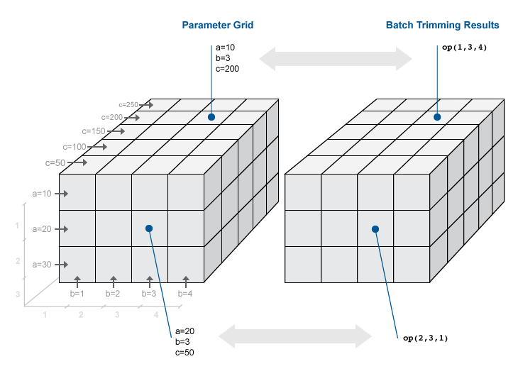 При одновременном изменении нескольких параметров создаются сетки параметров с более высоким размером. Например, изменение двух параметров дает матрицу параметров, а изменение трех параметров - сетку параметров 3-D. Рассмотрим следующую сетку параметров, используемую для обрезки партии: