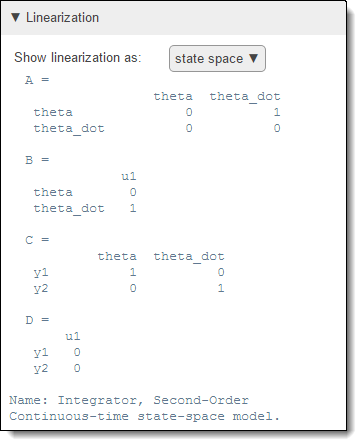 Чтобы убедиться, что блок линеаризован так, как ожидалось, проверьте уравнения линеаризации блока. По умолчанию программа отображает линеаризацию в формате state-space. В раскрывающемся списке Показать линеаризацию как (Show linearization as) можно выбрать другой формат отображения.