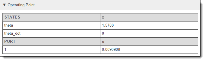 Рабочая точка блока; состояние и входные значения, для которых блок линеаризован.