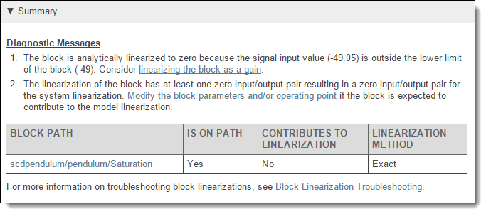 Некоторые диагностические сообщения предлагают решения соответствующих проблем линеаризации. Например, когда входной сигнал находится вне пределов насыщения блока Насыщения, диагностическое сообщение предлагает рассматривать блок как усиление во время линеаризации.