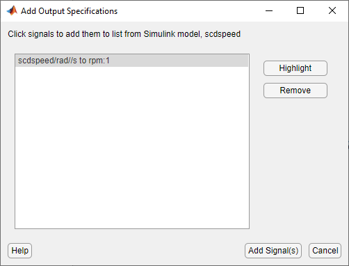 В диалоговом окне «Добавление выходных спецификаций» укажите сигналы, к которым требуется добавить выходную спецификацию. Чтобы добавить сигнал в список, в окне модели Simulink щелкните выходной сигнал блока rad/s to rpm. При этом сигнал добавляется в диалоговое окно «Добавление выходных спецификаций».
