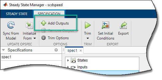 Поскольку модель не имеет портов вывода корневого уровня или определенных ограничений выхода обрезки, спецификация рабочей точки не имеет выходов. Чтобы добавить вывод в спецификацию рабочей точки, на вкладке Спецификация (Specification) щелкните Добавить вывод (Add Outputs).