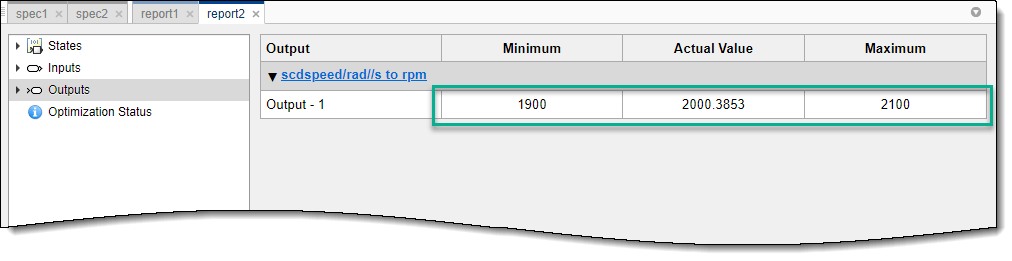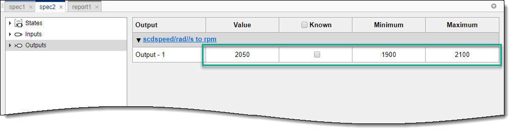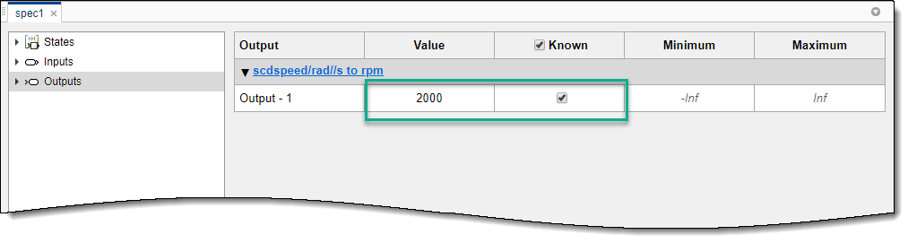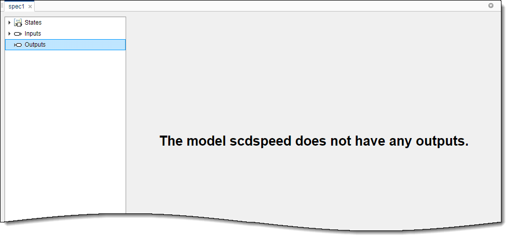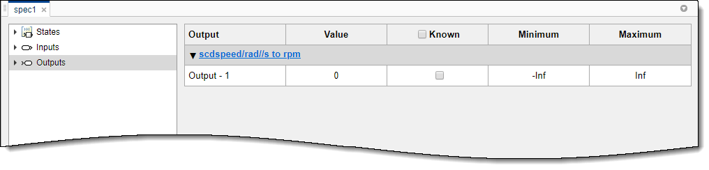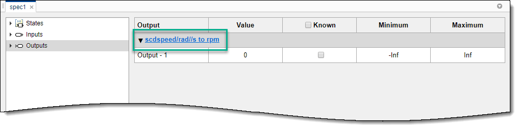 Программное обеспечение добавляет этот сигнал к spec1 в качестве выходной спецификации. Чтобы просмотреть и изменить спецификацию, в документе spec1 щелкните Вывод (Outputs).