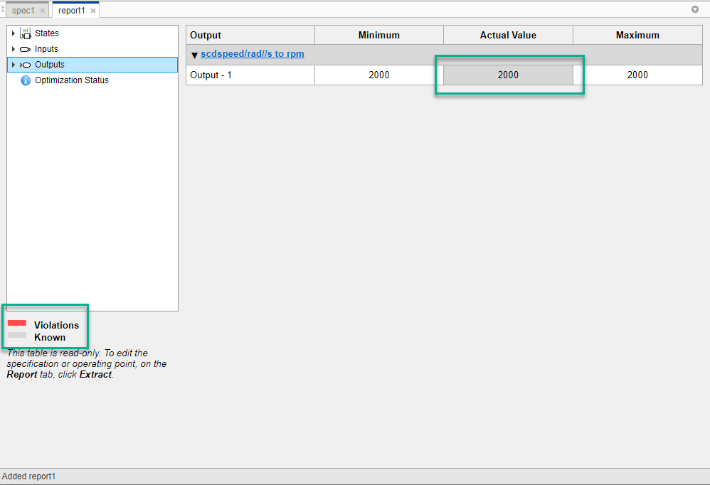 В этом примере поиск оптимизации сходится к рабочей точке, которая соответствует спецификации. Если отчет о поиске операционной точки показывает, что поиск не удался, можно проверить рабочую точку по спецификациям. Для этого в документе report1 в дереве навигации выберите спецификации, которые требуется проверить. В этом примере щелкните Вывод (Outputs).