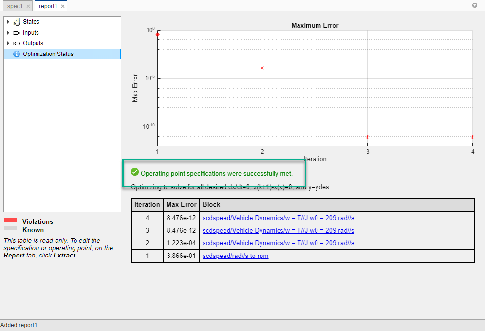 Чтобы проверить, сходится ли поиск оптимизации с решением, соответствующим спецификациям, в документе отчета1 щелкните Статус оптимизации.