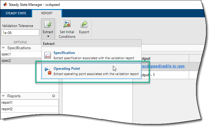 Можно также указать границы для спецификации, а не известные значения. Например, предположим, что имеется стационарное состояние в диапазоне от 1900 до 2100 об/мин. Чтобы найти эту рабочую точку, сначала создайте другую спецификацию путем копирования и редактирования предыдущей спецификации. В браузере данных щелкните правой кнопкой мыши spec1и выберите «Копировать».