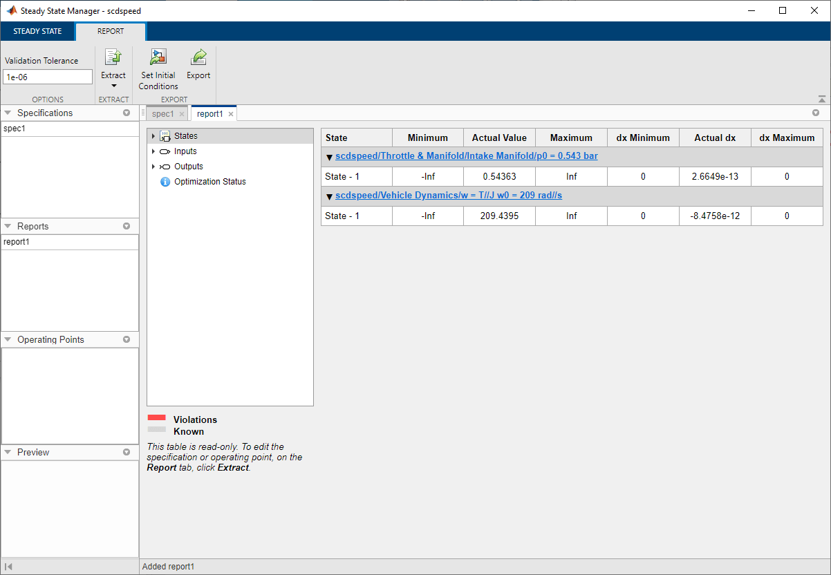 Можно также проверить, находится ли рабочая точка в устойчивом состоянии. Например, в документе report1 щелкните Состояния.