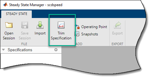 Чтобы создать спецификацию рабочей точки, в окне Диспетчер установившегося состояния (Steady State Manager) на вкладке Установившееся состояние (Steady State) щелкните Спецификация обрезки (Trim Specification).