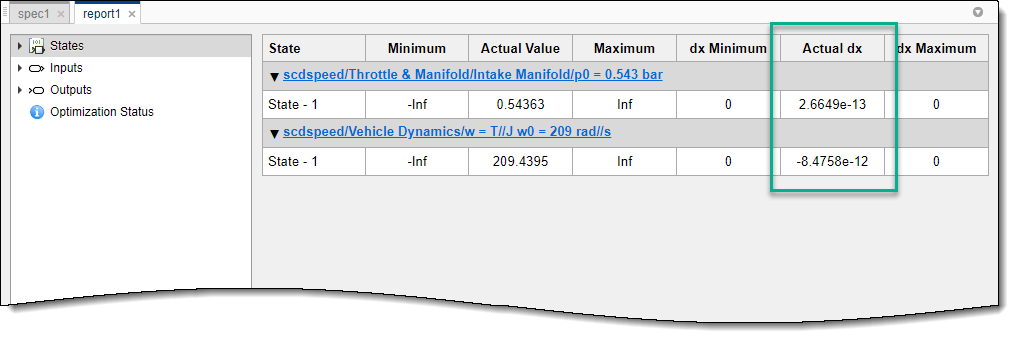 Столбец Actual dx показывает скорость изменения значений состояния в рабочей точке. Поскольку эти значения близки к нулю, состояния не изменяются, показывая, что рабочая точка находится в устойчивом состоянии.