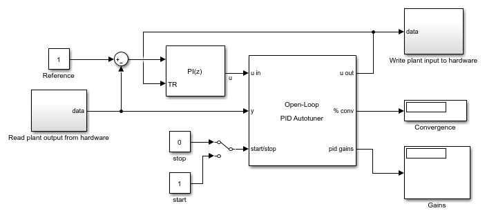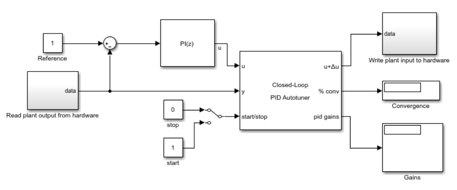 Развертывание блоков автозапуска PID позволяет настраивать систему в режиме реального времени без использования Simulink ® в цикле. Тем не менее, может быть полезно запустить алгоритм автотюнинга на аппаратном обеспечении, управляя экспериментом от Simulink.