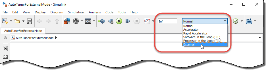 При настройке во внешнем режиме можно развернуть только алгоритм эксперимента, так что часть настройки PID вычисления выполняется в Simulink. Это позволит сэкономить память на целевом оборудовании. Для запуска алгоритма автоматического запуска PID во внешнем режиме требуется продукт генерации кода, например Simulink Coder™.